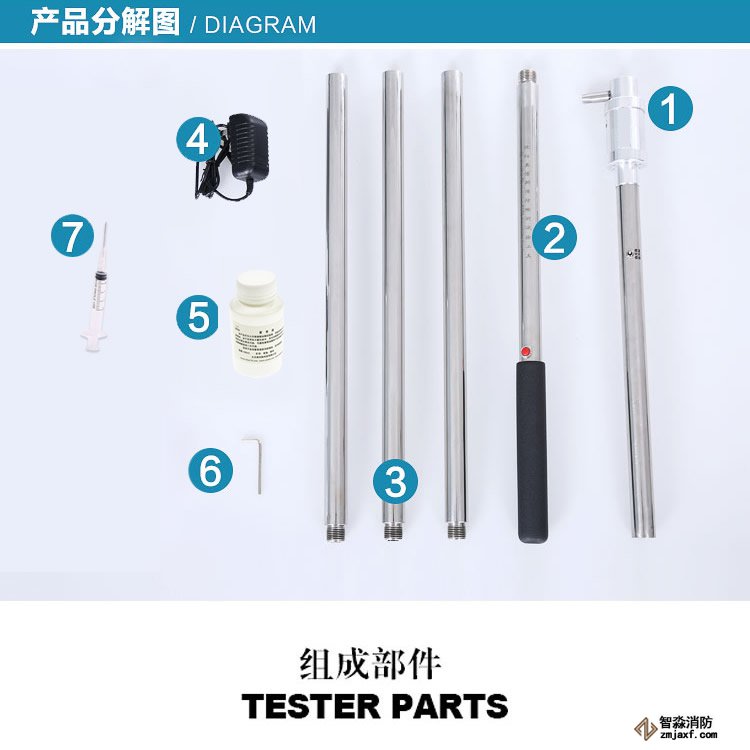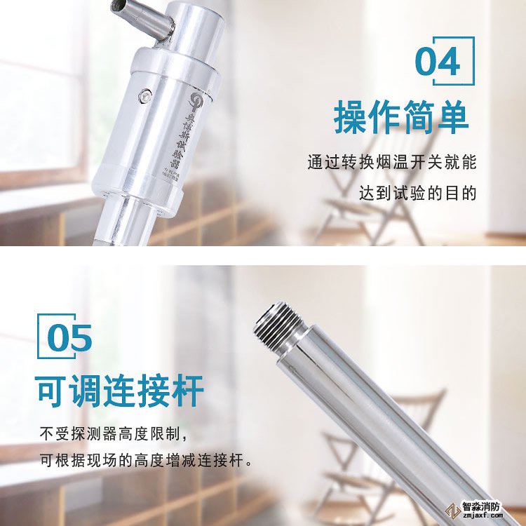 將槍頭、連接桿、電池桿相應順次連接,調整好加煙方向,按動啟動開關,指示燈亮,槍內風機工作,煙霧從噴頭出口噴入被試驗的火災探測器感煙迷宮,進行加煙試驗。